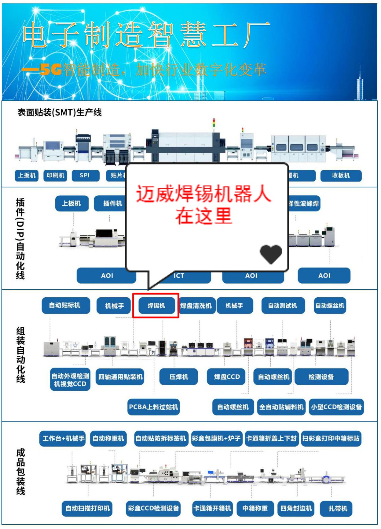 邁威是國內領先的焊錫解決方案專業(yè)提供商,專注于焊錫自動化領域,堅持務實的經(jīng)營理念,持續(xù)創(chuàng)新,為廣大電子產(chǎn)品制造商提供有競爭力的焊錫設備。并致力于焊錫技術的研究與推廣,不斷提升客戶產(chǎn)品競爭力。公司自推出首臺電腦版焊錫機以來,不斷加大在焊錫領域的研發(fā)力度,陸續(xù)推出了多軸全自動焊錫機、視覺焊錫機、伺服焊錫機、全自動焊線機、智能激光焊錫機等產(chǎn)品。